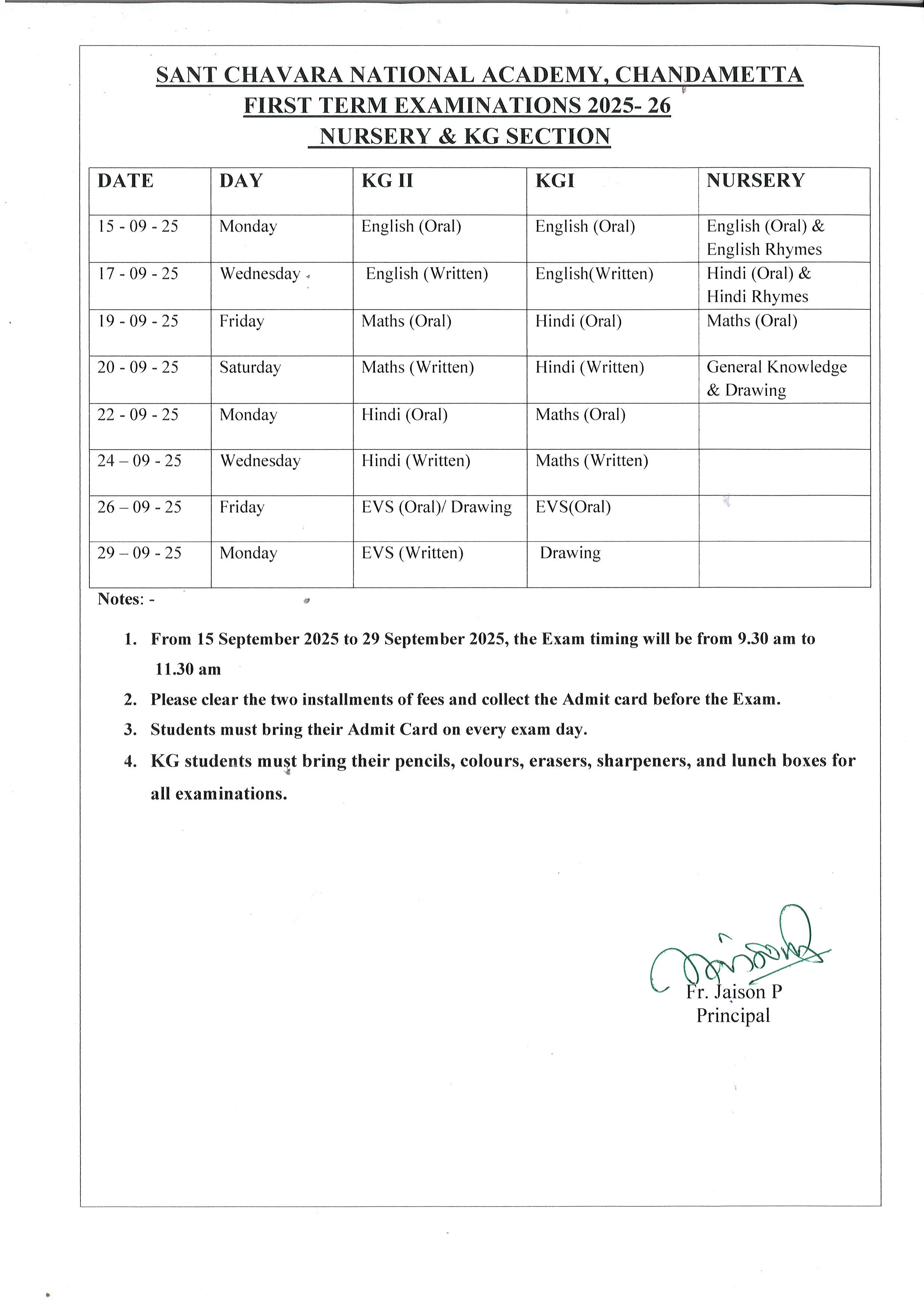 Time Table for First Term Examinations 2025- 26 (Nursery & KG Section)
