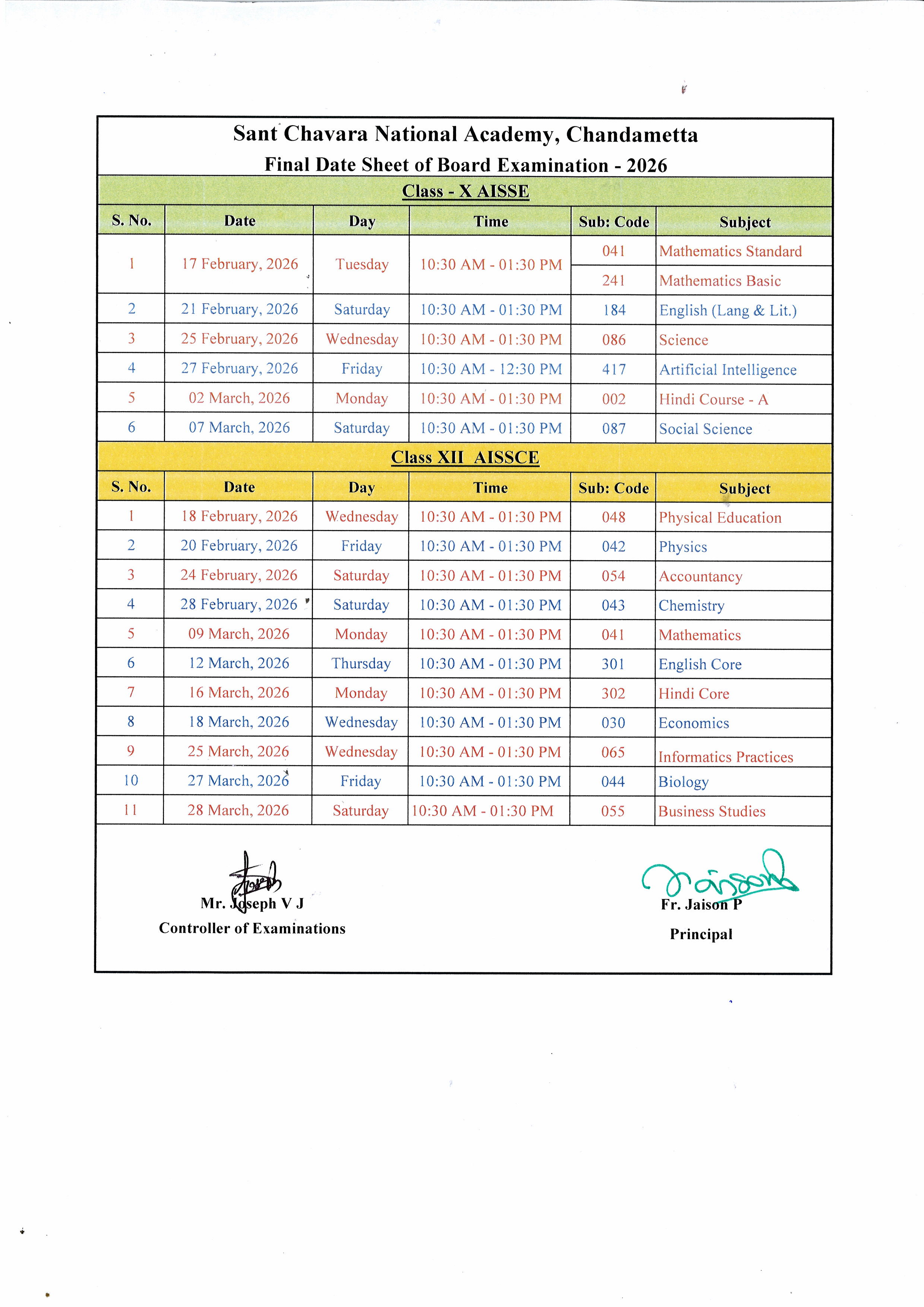 Final Date Sheet, Class X and XII Board Examination -2026