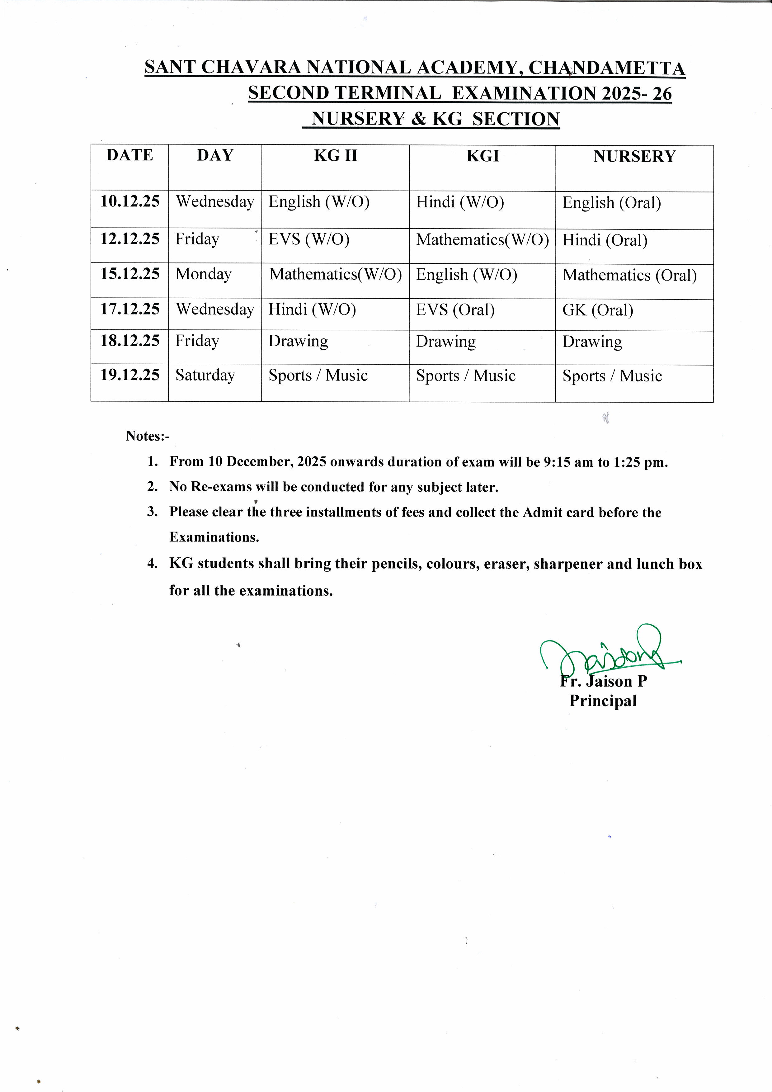 Annual Exam Schedule for Classes Nursery and KG