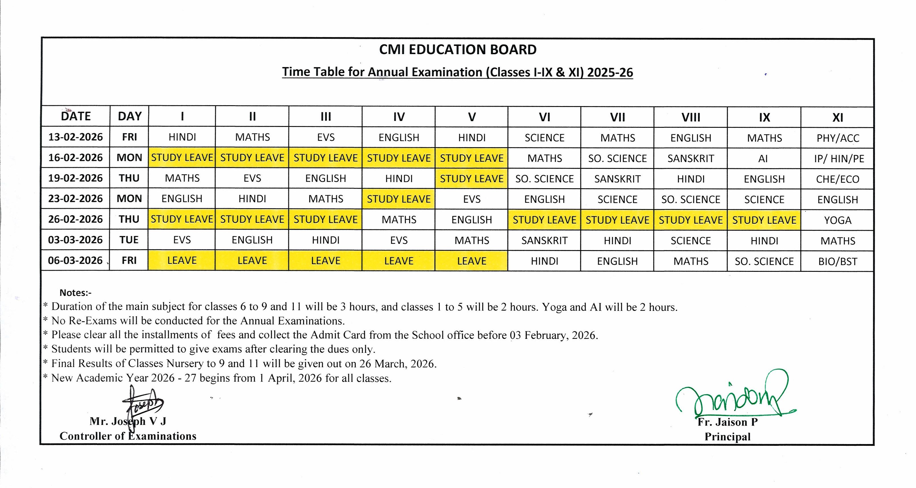 Time Table for Term II (Classes I-V), Half Yearly Examination (Classes VI-VIII) and Mid-Term Examination (Classes IX-XII) 2025-26